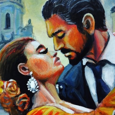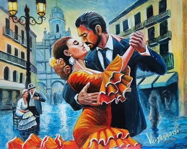 "Fusion of Passions" es una celebración visual de la conexión humana, inspirada en la intensidad del tango argentino y el flamenco español. La obra captura el abrazo íntimo de los bailarines, donde cada movimiento es una declaración de vida. Los tonos cálidos y las ricas texturas trabajan en conjunto para reflejar la complejidad emocional de esta unión, simbolizando el encuentro entre dos mundos que, más allá de sus raíces, comparten una pasión inigualable.