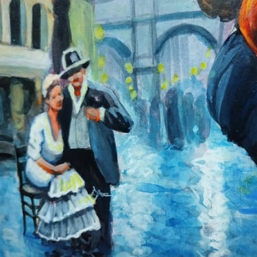 "Noche de Flamenco" es un tributo vibrante a la pasión y la energía del flamenco. Bajo la luz cálida de una feria nocturna, la figura de una bailarina se convierte en el símbolo del fervor y la melancolía del baile. Los colores audaces y las pinceladas dinámicas capturan la esencia de este arte, haciendo de la obra una invitación a sumergirse en el alma y el sentimiento del flamenco.