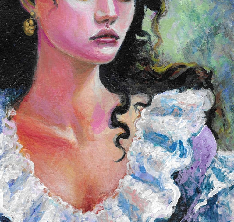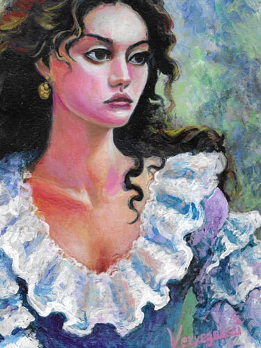 "Serenidad Andaluza" celebra la calma y la riqueza de las tradiciones de Andalucía. En el corazón de la obra, una joven en traje típico irradia elegancia y dignidad. Cada detalle, desde el bordado del corpiño hasta las flores en su cabello, rinde tributo a la artesanía y la cultura de la región. Con pinceladas sueltas y colores luminosos, este cuadro captura un instante atemporal, donde la tradición y la introspección se fusionan en una conexión inolvidable.