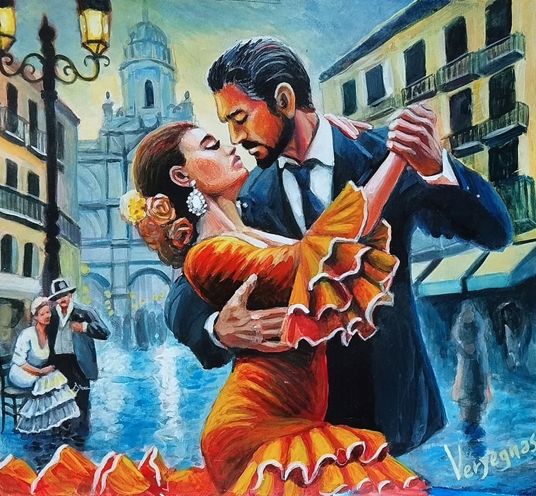 En "Encuentro de Pasiones" se fusionan dos tradiciones: el flamenco y el tango. La bailaora y el bailarín se entrelazan en un abrazo lleno de fuerza y emoción, enmarcados por una calle empedrada y la majestuosa silueta de la catedral. Los vibrantes contrastes entre el vestido de la bailaora y la elegancia del traje del tanguero realzan una conexión universal, mientras detalles como la pareja en el fondo y la lluvia que acaricia el suelo aportan autenticidad y un toque de melancolía.