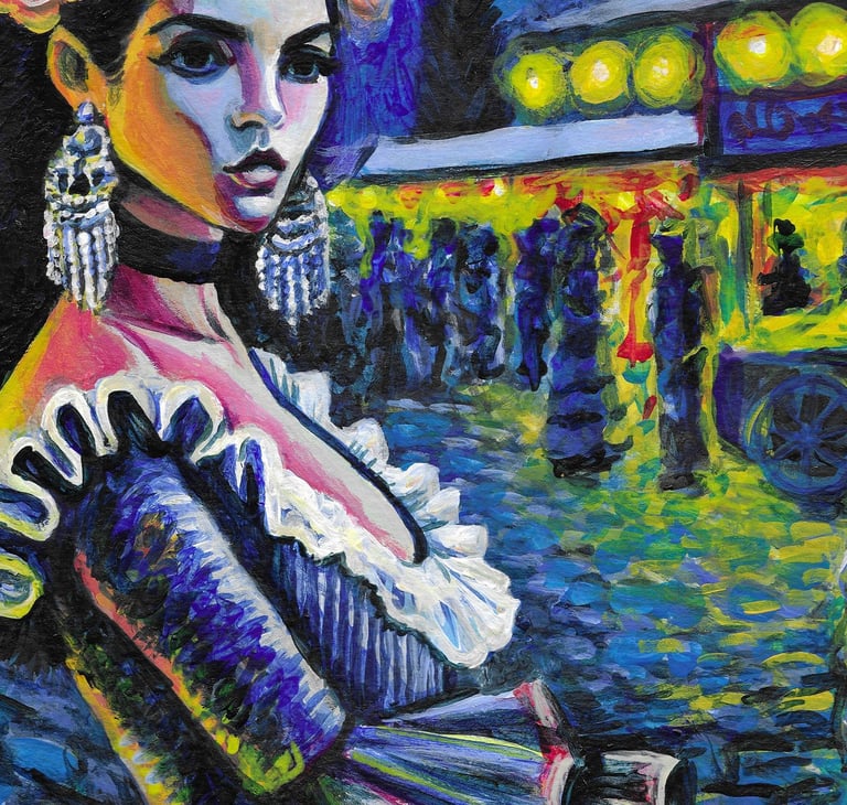 "Misterio de la Noche" envuelve al espectador en la enigmática atmósfera de la feria nocturna. La figura de una bailaora, vestida en un rojo intenso, se convierte en el epicentro del misterio y la atracción. Las pinceladas fluidas y el juego de luces y sombras sugieren historias ocultas, celebrando el patrimonio cultural español a través de la dualidad entre belleza y secreto.
