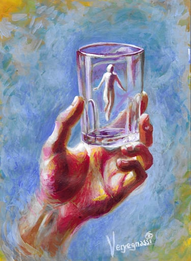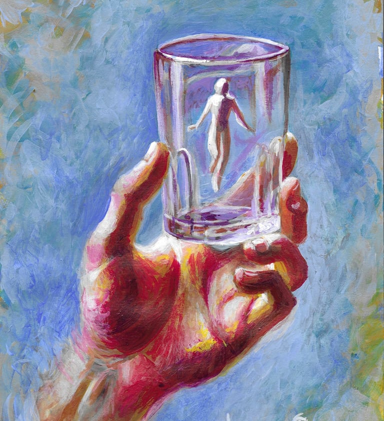 "Ahogándose en un Vaso de Agua" representa la forma en que amplificamos nuestras preocupaciones, mostrando cómo muchas veces somos nosotros mismos quienes alimentamos esas sensaciones de ahogo. La figura flotando serenamente dentro del vaso nos recuerda que nuestras angustias, aunque intensas, son insignificantes cuando se ven en perspectiva. Con colores vibrantes y una tensión visual entre la mano sólida y el vaso transparente, la obra invita a reflexionar sobre la manera en que enfrentamos nuestros problemas y cómo podemos liberarnos de ellos.