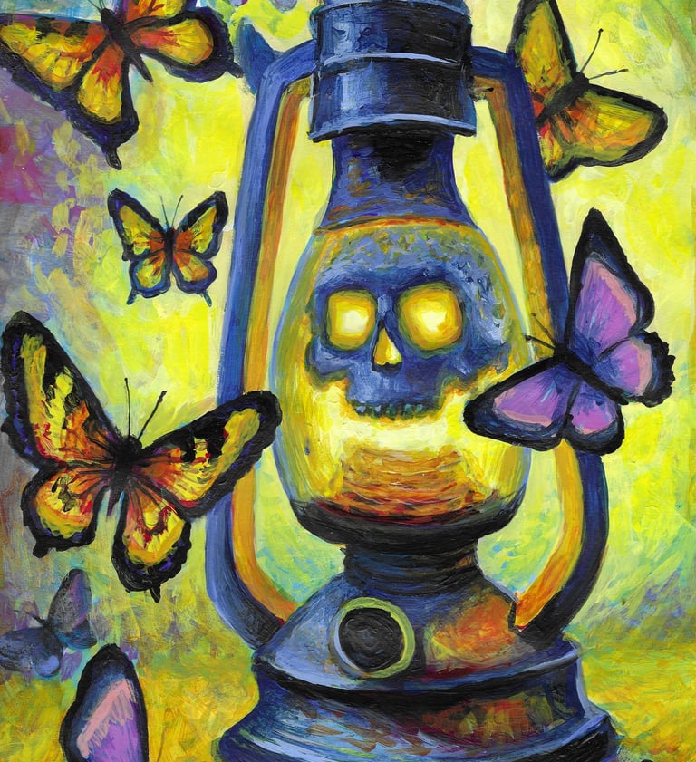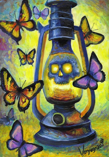 "Eternal Glow" refleja la dualidad de la vida y la muerte a través del simbolismo del arte del tatuaje. La lámpara, como un faro de esperanza, alberga una calavera brillante que sugiere que la muerte es solo una transición hacia algo nuevo. Las mariposas que orbitan a su alrededor simbolizan la efimeridad de la vida y la constante búsqueda de transformación.