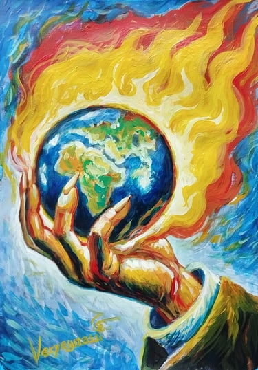 El fuego que rodea la Tierra no solo señala la crisis ambiental, sino también la pasión y el poder transformador que poseemos para cambiar el rumbo. "Guardianes de la Tierra" es un llamado a la acción, una invitación a ser parte del cambio que el mundo necesita.