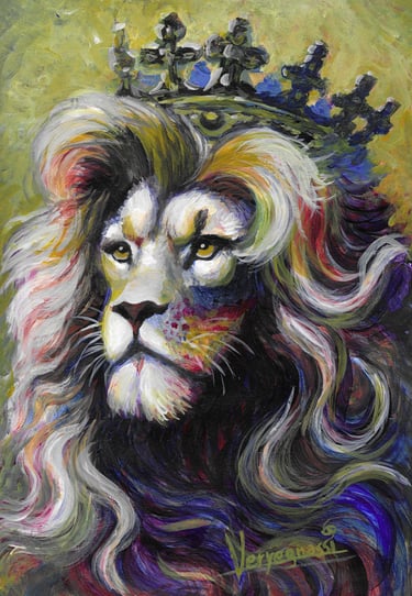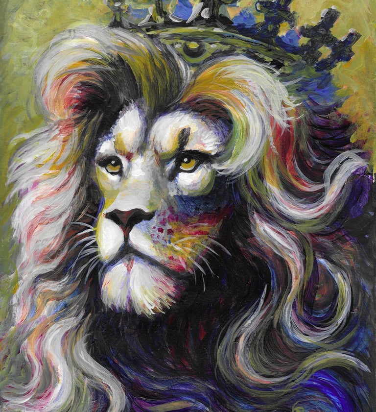 "Majestad Ancestral" explora el profundo simbolismo del león como emblema de poder, sabiduría y realeza, dentro de la serie "Tattoo Inspiration". Con su melena vibrante y coronado en su trono etéreo, la obra combina la fluidez de las acuarelas con la fuerza de los acrílicos, creando una presencia visual que va más allá de lo terrenal. El fondo verde dorado enmarca al león, realzando su majestad sin desviar la atención de su imponente figura.