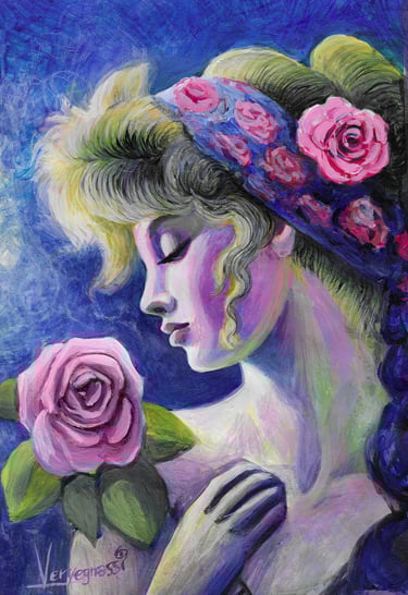 "Whispers of the Rose" invita a un momento de introspección y serenidad, retratando a una mujer que sostiene una rosa cerca de su rostro, en un diálogo silencioso consigo misma. Con una paleta de colores suaves y una técnica que combina acuarelas y acrílicos, la obra crea una atmósfera de calma y contemplación, reflejando la conexión entre la belleza exterior y la introspección interna.