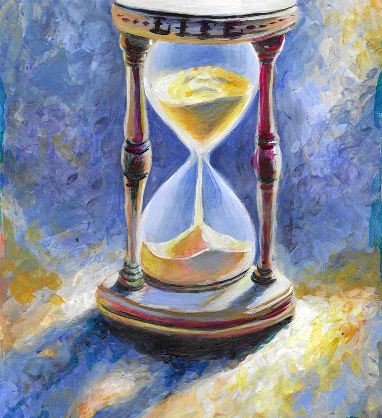 Con una paleta cromática intensa y una textura detallada, esta obra nos insta a vivir conscientemente, apreciando cada momento como único e irrepetible. "Memento Mori" es una llamada a despertar, a valorar cada segundo y a reflexionar sobre cómo utilizamos nuestro tiempo en este delicado equilibrio entre lo finito y lo eterno.